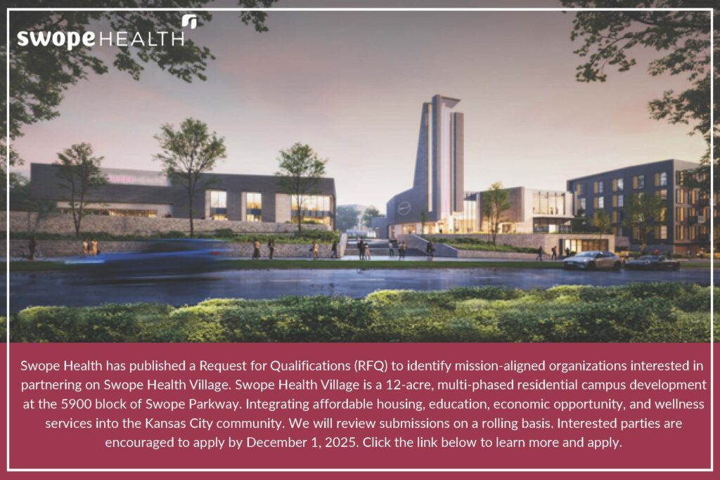 Swope Health Village is a 12-acre, master planned, multi-phased residential campus development at the 5900 block of Swope Parkway that integrates affordable housing, education, economic opportunity, and wellness services into the Kansas City community. Swope Health Village will offer a comprehensive range of services and amenities across numerous areas to support the community. These include …