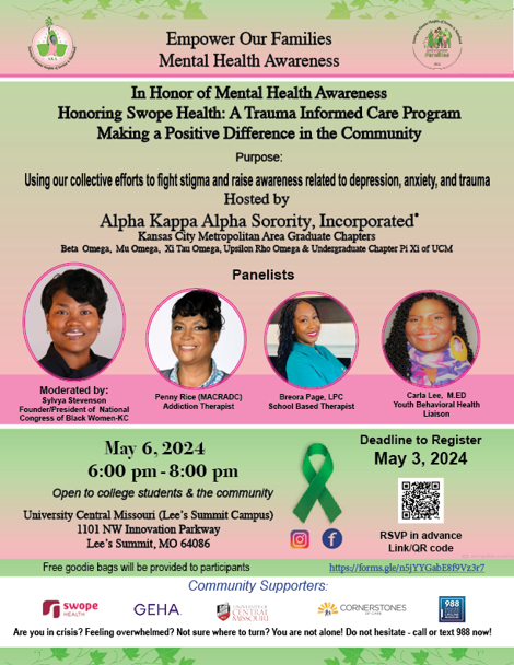 This month, Swope Health will receive recognition for its role in serving mental health with an award from the Alpha Kappa Alpha Sorority Inc.’s Kansas City Metropolitan Area Graduate Chapters. Swope Health will be honored at an event at 6 p.m. Monday, May 6, at the University of Central Missouri, Lee’s Summit Campus, 1101 NW Innovation Parkway, Lee’s Summit, MO 64086.